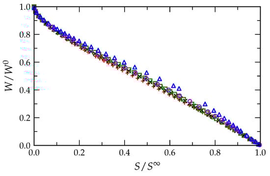 As discussed in [], the scaled interaction energy turns out to be remarkably similar for all considered systems and band fillings. Further investigations on the Hubbard model have shown that the relative change in W caused by a change in is also approximately independent of the system size and lattice dimension [,,,,,]. This indicates that the largest part of the dependence of W on is a consequence of the changes in the domain of representability of as defined by the limits of weak and strong correlations. It is therefore reasonable to regard the scaled interaction as a function of the degree of electron delocalization , which is nearly independent of the system under study, even though the relation between and does depend on the charge distribution in inhomogeneous models.