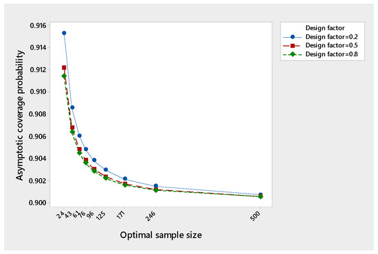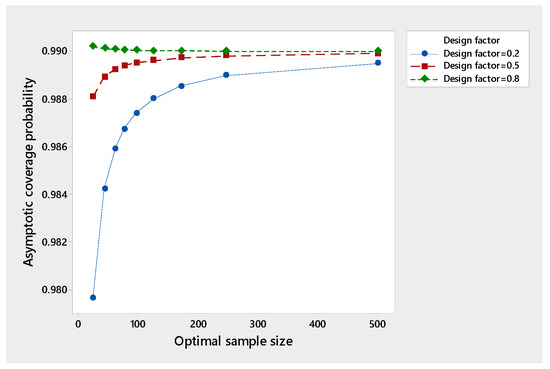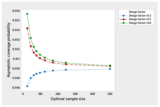 Asymptotic coverage probabilities for different values of as the optimal sample size increases.