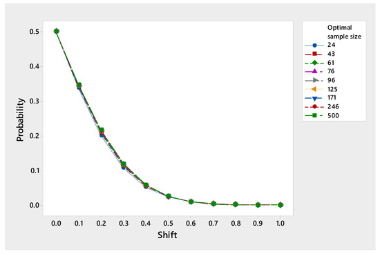 Let be the probability of committing a type II error probability, which is the probability of no shift occurring given that an actual shift occurred. Our objective is to control the probability of committing a type II error probability. We do so by finding the characteristic operating curve that gives the probability of acceptance of various possible values of . The minimum sample size required to control both is