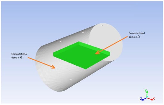 The model’s geometry is shown in Figure 3. It consists of two computational domains—the void volume of the reactor and the porous catalyst. The reactor has 3 inlets and 2 outlets 2 mm in diameter each. The reactor is represented as a horizontal cylinder with 55 mm diameter and 105 mm length. The catalyst has a form of a box with dimensions 50 × 50 × 5 mm (L × W × H).