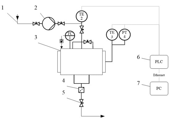 Data collection from TE3, PT4 sensors was carried out by a programmable logic controller (6). Furthermore, all data from the programmable logic controller (PLC) were transferred to a personal computer (7).