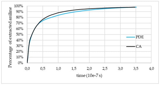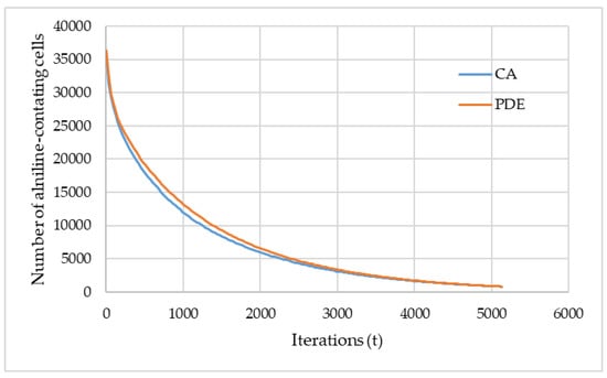 The presented curves demonstrate the evolution of the number of cells with the state “S1” (corresponds to aniline) predicted by the CA and PDE approaches, and the main target of comparing these curves is to adjust the CA model parameters. During the adjustment of the CA model parameters, the corresponding curve approaches the curve obtained using the PDE model. Figure 8 shows the accuracy achieved in this work with regard to the adjustment.