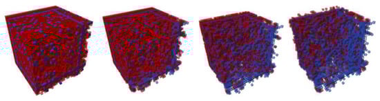 A visual representation of aniline diffusion in a porous catalyst, obtained using a cellular automaton model, is shown in Figure 10. Cells marked in red correspond to the aniline, the blue color relates to the catalyst skeleton. As one can see, the aniline leaves the catalyst internal volume in a certain direction determined by the alcohol flux and boundary conditions. However, the aniline spatial inhomogeneity itself is not analyzed in this work, and the aniline integrated amount is considered as the most important data.