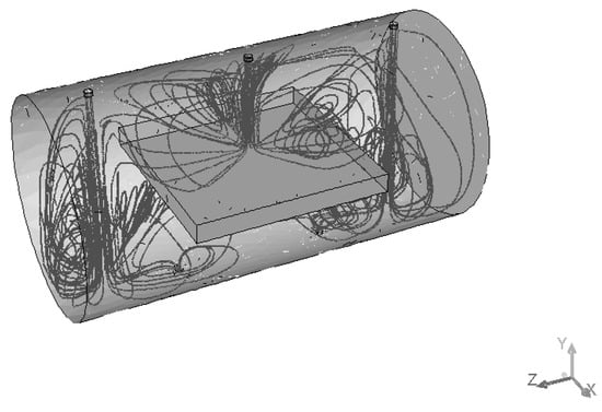 Path lines starting from inlets (The Figure is prepared with the outer face cut to show boundary surfaces and internal area at the same time).