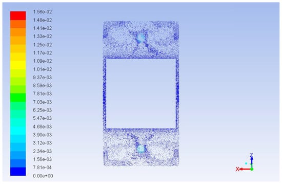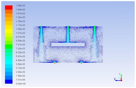 Figure 11 demonstrates the path lines starting from inlets. As can be seen, there are some circular loops because of hydrodynamic effects. These circulating flows cause substances to stay in the reactor longer than they should. The same thing can be seen from the velocity vector fields shown in Figure 12 and Figure 13. These velocity vector fields are projections of velocity vectors on YZ and XZ cross sections respectively. In spite of comparatively low velocities three jets are clearly visible underneath the inlets. The central jet because of the impact with the porous body surface goes sidewards and upwards then creating multiple loops. At the same time outer jets interacting with the reactor wall at the bottom show a similar behavior with circular loops underneath the catalyst.
