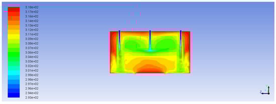 Temperature profile (XZ middle cross section, the reactor walls and the catalyst boundary are not shown, color map is indicated in K units).