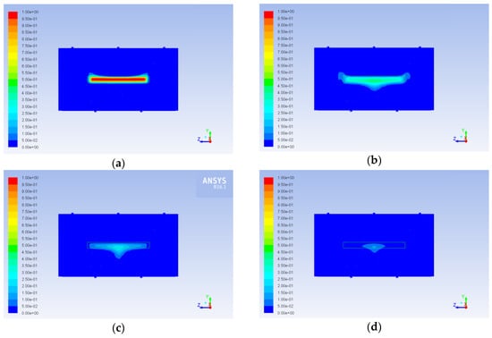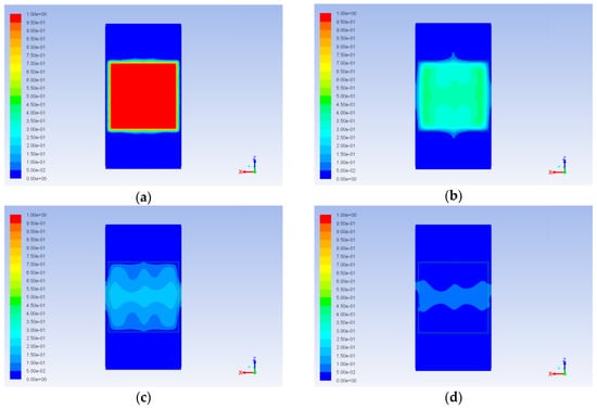 Aniline mass fraction profile (XZ middle cross section, the reactor walls are not shown, maximum value of the color map corresponds to pure aniline): (a) 500 s, (b) 10,000 s, (c) 20,000 s, (d) 30,000 s.