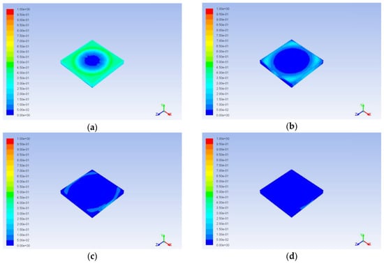Aniline mass fraction profile (catalyst external surface, maximum value of the color map corresponds to pure aniline): (a) 500 s, (b) 10,000 s, (c) 20,000 s, (d) 30,000 s.