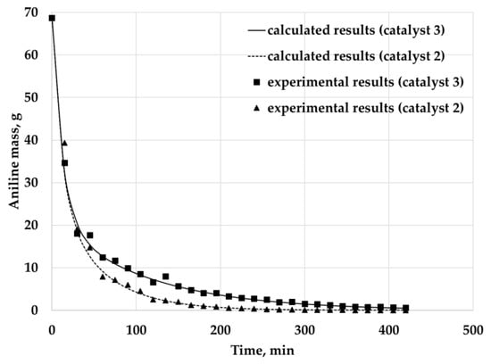 Comparison of experimental and calculated data is shown in Figure 19. The curves represent change of aniline total mass inside the reactor within time. Experimental data were calculated using the measured concentrations at the outlet of the reactor. Calculated data were obtained via integration over the computational domain.