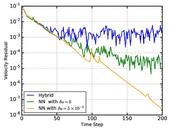 Instead, hybrid models have been proposed, in which the computationally favorable continuum solver is predominantly used, while using a molecular solver for the under-resolved flow features. However, the MD simulations must run relatively frequently, sometimes at each macroscopic timestep, which significantly increases the computational requirements. Instead ANNs have been used to provide molecular-level information to a CFD solver, thus enabling a computationally efficient resolution of such scales [46,47]. As with the QM-based simulations described above, the MD solver is only used when it encounters relatively new states, i.e., states that are outside a pre-defined confidence interval from previously encountered states. As the simulation progresses and more states are encountered, the ANN is primarily used. The ANN-based hybrid model captures the flow physics very well. Furthermore, while the thermal noise, inherent in MD simulations, prevented the continuum solver from converging satisfactory, the NN-based hybrid model suppressed the thermal fluctuations resulting in lower residuals and better convergence of the solution (Figure 3).