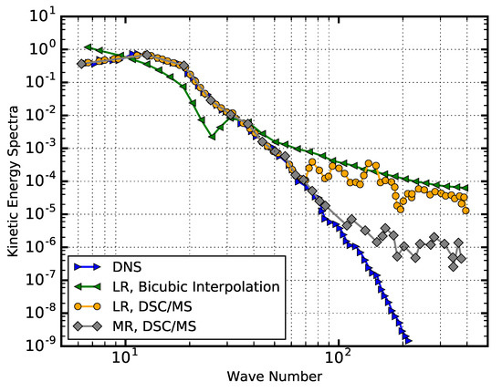 A recent study successfully used ML algorithms that take very coarse CFD results of two-dimensional turbulent data, and reconstruct a very high-resolution flow field [73]. The coarse input data was obtained by using average or max pooling on the DNS data. The authors downsampled the data to different resolutions: medium, low, and very low. They reconstructed the data back to the DNS resolution, either using basic bicubic interpolation, CNNs, or a ML hybrid algorithm, called Downsampled Skip-Connection/Multi-Scale (DSC/MS), which, in a way, is a specific CNN architecture. For various two-dimensional cases, the reconstructed output accurately matched the original DNS data. The kinetic energy spectra calculated by the DSC/MS matched the results of the DNS (Figure 4) very well, at least within the resolution of the corresponding downsampled input, i.e., the data resulting from reconstructing the medium resolution input matched the DNS data for a larger range of wave numbers than that obtained from the low resolution input (c.f. grey and orange curved in Figure 4).