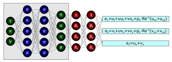 Automatic differentiation has been used over the last few years to solve supervised learning problems using ANNs that respect the laws of physics, given as partial differential equations [160,161,162]. An excellent example of the potential use of such an approach is given by Raissi et al. [163]. The paper solves the inverse problem of calculating the lift of a bluff body, given sparse data of the flow field, a difficult task using conventional numerical schemes. The algorithm is based on two coupled DNNs (Figure 5): the first is a traditional black-box ANN that takes flow input parameters, such as time, and coordinates, and outputs details of the flow, such as the velocity components, pressure, and the displacement of the solid body. Sigmoid activation functions were used for the neurons of this ANN. The output of the first network is then linked onto the physics-informed network that generates the equations, where derivatives are used as activation functions. The cost function of the entire NN is the sum of the two cost functions of each NN.