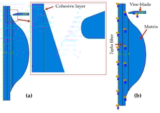The FEM and geometry used were similar to the microbond test experiment, as shown in Figure 1. The commercial finite element software Abaqus 6.14 (Dassault Systèmes Simulia Corp., Johnston, RI, USA) was used to generate the model and analyze the Typha fiber/epoxy microbond test. The axisymmetric model was generated to model the microbond test specimen with a cohesive layer between the fiber and matrix with 0.01 mm thickness, as shown in Figure 2, where the embedded length, fiber radius, and droplet height were 1.67, 0.125, and 0.3 mm, respectively. The vise blade was 0.78 mm away from the interface. The vise blade was modelled as a rigid body. The hard contact type was selected as the interaction between the blade and resin. Tie constraints were used to tie fibers to the cohesive layer and matrix. A displacement load of 0.466 mm was applied at the end of the fiber. The magnitude of displacement was obtained from experiments. The edge of the fiber and matrix provided the asymmetrical boundary condition, where only the Y plane axis is free (U1 = U2 = UR3 = 0), while the vise blade is in the fully built-in fixed support condition (U1 = U2 = UR1 = UR2 = UR3 = 0). Finite element analysis was performed on an ASUS computer (AsusTek Computer Inc., Taipei, Taiwan) with an Intel core i9 processor (Intel Corp., Santa Clara, CA, USA) and 16 GB RAM.