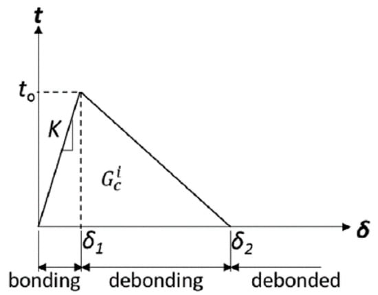 Dugdale [] and Barenblatt [] introduced the cohesive zone model in 1960 and 1962, respectively, when solving the problem of cracking of perfect brittle material. Three modes of fractures, opening mode, sliding mode, and tear mode, can appear at the interface between the fiber and matrix when the loading conditions are applied to the composite. The cohesive zone model specifies three bond conditions for each fracture mode: elastic bond, debonding, and debonded conditions. All the fracture modes can be characterized by a traction–separation (t–δ) curve as shown in Figure 4. The condition of the elastic bond is determined by the interfacial stiffness (K), which is the elastic constitutive matrix that relates t and δ, as shown in Equation (1).