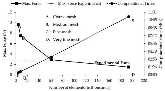 The force–displacement curve was obtained from the mesh sensitivity study in the microbond test model, as shown in Figure 5. A, B, C, and D represent the coarse, medium, fine, and very fine mesh, respectively, corresponding to P, Q, R, and S, respectively, which represent computational time. We found that the higher the number of the elements, the lower the reaction force; this indicated that mesh selection affected the simulation result. Figure 5 shows that the coarse mesh had the highest force, which was 9.7 N; the lowest force on the very fine mesh was 1.5 N. The maximum forces for the medium and fine meshes were 7.5 and 2.9 N, respectively.