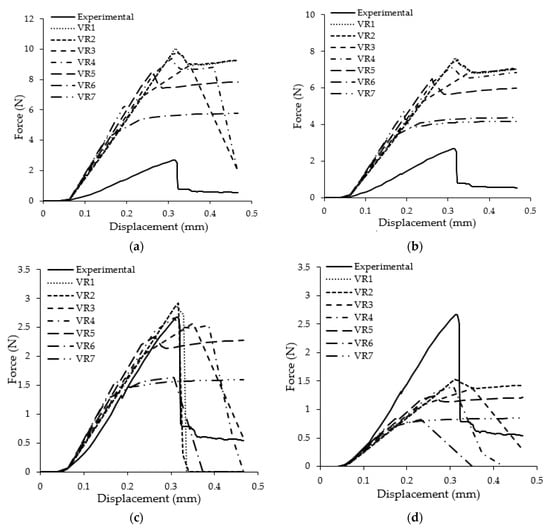In the simulation, the damage initiation parameter value was varied from 200 to 270 N/mm2. The variation of the cohesive properties with coarse mesh showed that the maximum force was around 5–10 N. This maximum force exceeded the value obtained from the experiment. For medium mesh, the maximum force was 4–7 N. Based on the image, VR3, VR4, and VR6 show that the curve decreased after reaching maximum force. The simulation of the Typha fiber/epoxy microbond test with various cohesive properties on the fine mesh is shown in Figure 6c. We found that the curve was similar to the experimental curve; almost all curves had a maximum force close to the experimental value except for VR6 and VR7. The VR2 curve was the most similar to the experimental results. Figure 6d depicts the results of various cohesive properties on very fine mesh, showing that the maximum force is below the experimental result. Only the VR4 curve decreased after reaching the maximum force.