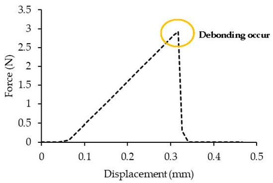 Figure 7 displays the microbond test simulation results, which show the force and displacement of Typha fiber/epoxy. The force–displacement curve illustrates that the matrix is still attached to the fiber until a maximum force of 2.9 N at 0.31 mm displacement. After reaching the maximum force, the line on the curve decreases sharply, which reveals debonding has occurred. As illustrated in Figure 8, the debonding phenomenon is similar to the results of the simulation conducted by Hao et al. [] for a carbon fiber/bismaleimide composites microbond test, but with a different magnitude.