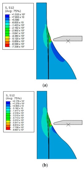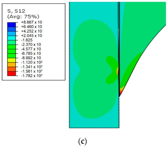 Contour plot of shear stress (MPa): (a) vise blade first hit matrix, (b) then hit the matrix, and (c) immediately before debonding.