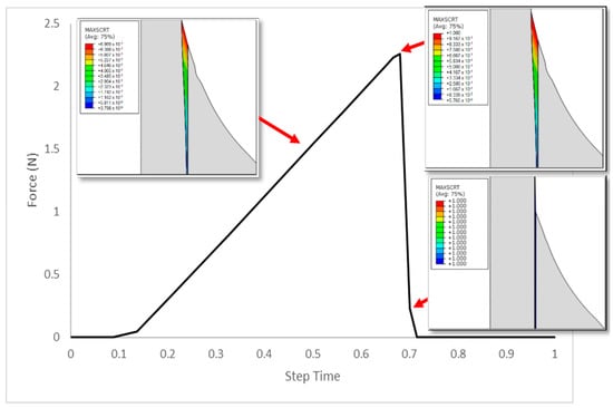 Figure 9 illustrates the maximum traction damage initiation criterion (MAXSCRT), which is a scalar parameter where total failure is equal to one. The blue and red contours indicate lower and higher MAXSCRT values, respectively. At a step time value of 0.5, red and blue contours were valued at 0.697 and 3 × 10−5, respectively, which means failure at the upper cohesive layer has not started. When the step time was 0.689, the upper cohesive layer started to fail due to the value of the red contour reaching 1, while the blue contour was 5 × 10−5. The cohesive layer totally failed after a step time of 0.7, as indicated by both the value of red and blue contours reaching one.