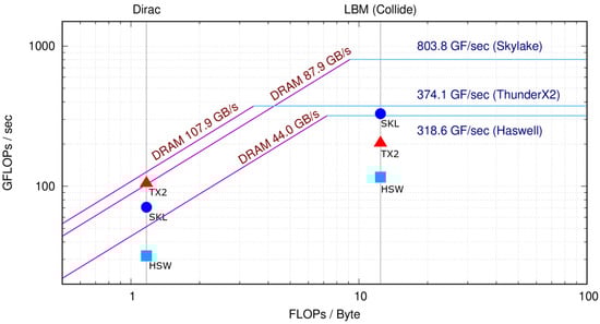 The Dirac operator function has a low computational intensity (i.e., ≈1), is commonly memory-bound and thus its performance typically benefits from architectures with a low machine balance; moreover, given the high register pressure, it commonly benefits also from an efficient caches sub-system. In fact, in Figure 2, we see that it achieves the highest performance when running on the TX2, reaching a performance ≈ higher than Skylake and ≈3.4 than Haswell.