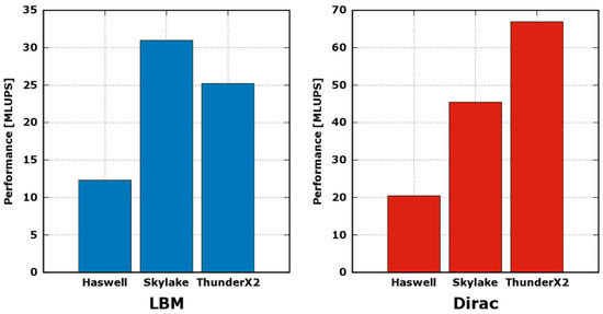 Performance in MLUPS (Mega Lattice-Updates per Second) of LBM and Dirac, run, respectively, on a lattice of points, and sites.