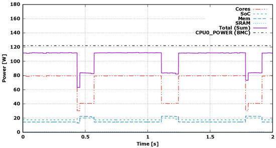 To show the validity of these measures, we plot in Figure 4 also the value of the CPU0_POWER sensor, acquired through IPMI, an off-chip external measurement collected by the BMC. This value is almost in line with the sum of the TX2 embedded sensors; the difference () may be due to the more coarse grained sampling, as well as the dissipation across the power distribution lanes and other circuits possibly interposed between this off-chip sensor and the on-chip ones.