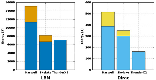 The results are reported in Figure 5, where orange and yellow bars correspond to DRAM energy, reported only from RAPL counters. For the TX2, this value is not available, but, taking into account that the DRAM technology is the same as in the Skylake, with slighter higher frequency (2666 MHz instead of 2400 MHz) and number of modules (eight instead of six), we assume that the contribution on the overall energy consumption for the TX2 to be slightly higher, but in the same order of magnitude. We report the Intel RAPL DRAMs values, just for reference.