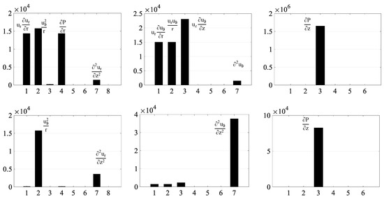 Bar plots of the order of magnitude of various terms in NavierβStokes equations (Equations (3)β(5)) at indicative operating conditions depicting the relative importance of each term. Top: h = 0.5 mm, Ο1 = 5000 rpm, = 0.5 m/s. Bottom: h = 0.1 mm, Ο1 = 5000 rpm, = 0.01 m/s.