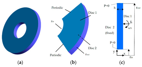 The simplified model of the fluid film between two consecutive discs of the clutch is presented in Figure 2. The upper disc rotates with angular velocity (Ο1) (representing engine speed) and at the same is moving axially downwards due to the force applied on it by a linear actuator, representing the working principle of a wet multidisc clutch. The lower disc is rotating with angular velocity (Ο2) (representing output shaft speed) and is assumed to be fixed along the axial direction. The discs are considered rigid and flat, the flow outlet pressure is equal to atmospheric, and the inner and outer radius of discs are denoted as (rin) and (rout), respectively.