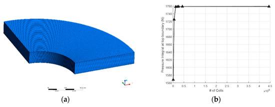The validity of the pressure distribution corresponding to Equation (15) was investigated through a comparative study with the results from a CFD model where the full set of equations was used for solving the problem. The geometry of the model along with the boundary conditions (Equations (6)β(9)) are presented in Figure 4. The CFD environment used was ANSYS Fluent and the model was treated as 3D. However, in order to save computational time, the problem was modeled as 2D axisymmetric including swirl. For both approaches a mesh independency study was conducted (Figure 5) and the results were compared and found to be in good agreement.