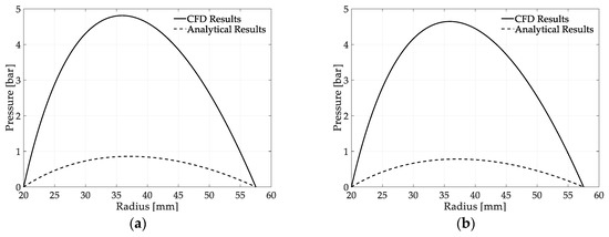 where (w) is the swirl velocity. The flow was considered steady for each gap closing velocity, , laminar, and the sum of residuals was set below 10β6 for all equations. For the needs of this study, Disc 2 was assumed fixed. SIMPLE algorithm was used for the couple of pressure and velocity, and second order upwind spatial discretization scheme was used for the momentum conservation and pressure equations. The results of the pressure distribution versus radius are presented in Figure 6 for six operational points of the clutch. Examining Figure 6, the deviation of the pressure analytical expressions to the CFD results is observed, especially in the case where the film thickness had the value of the normal open gap (0.5 mm). This happens because the terms neglected in Equations (11) and (12) hold a considerable influence in these operating conditions. As the film thickness decreases (0.1 mm), the agreement of the analytical results to the CFD-obtained ones improved, as expected because terms including first- and second-order derivatives with respect to (z) became dominant.