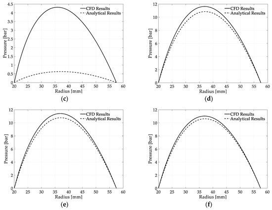 Pressure distribution vs. radius, (a) h = 0.5 mm, = 0.5 m/s, and Ο = 1000 rpm; (b) h = 0.5 mm, = 0.5 m/s, and Ο = 3000 rpm; (c) h = 0.5 mm, = 0.5 m/s, and Ο = 5000 rpm; (d) h = 0.1 mm, = 0.05 m/s, and Ο = 1000 rpm; (e) h = 0.1 mm, = 0.05 m/s and, Ο = 3000 rpm; (f) h = 0.1 mm, = 0.05 m/s, and Ο = 5000 rpm.