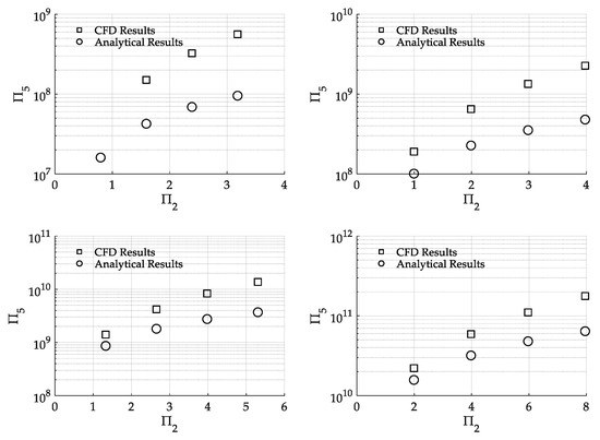 In Figure 10 and Figure 11, the comparison of the value of (Ξ 5) obtained from the CFD results and the calculated (Ξ 5) from the analytical pressure distribution (Equation (15)) is presented with respect to (Ξ 2). For the needs of illustration, the results are given for a specific value of (Ο = 3000 rpm), while (h) and () were used as independent varying parameters in the plots. Selecting a specific value of (Ο) was justified from the small influence it had on the developed pressure compared to (h) and (), as depicted in Figure 7 and Figure 8. Due to increased magnitude of (Ξ 5), Log10 scale was used for its axis and, therefore, negative values were omitted. Furthermore, two sets of plots are presented in Figure 10 and Figure 11, where one of (h), () was varying and the other one was assumed fixed, having the values of Table 2. The case where (h) was varied and () was assumed constant (Figure 10), was associated with the utilization of a constant closing velocity which is maintained by the clutch actuator during the engagement process. Instead, the case where () was varied and (h) was assumed constant (Figure 11) corresponded to a constant engagement force.