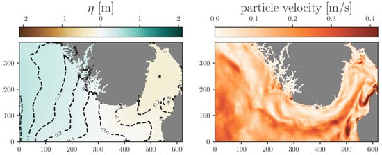 The shallow-water equations consist of three coupled nonlinear partial differential equations that describe conservation of mass and momentum. In our case, they are formulated using , the surface deviation from the equilibrium water level, and volume transport and along the abscissa and ordinate, respectively. Source terms represent varying bathymetry and the Coriolis forces, which take into account that we solve the equations on a rotating sphere. The equations can be used to model gravitational waves, in which the governing motion is horizontal, e.g., the ocean [6,7]. An oceanographic simulation scenario using our simulator is shown in Figure 2.