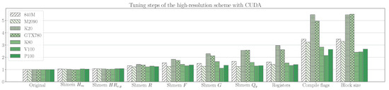 The numerical schemes are algorithmically well suited for the GPU, but little effort has been made to thoroughly optimize the codes’ performance on a specific GPU. It is well known in the GPU computing community that performance is not portable between GPUs, neither for OpenCL nor CUDA, and automatically generating good kernel configurations is an active research area (see, e.g., [44,45,46]). We started by porting the three schemes to CUDA before using the available profiling tools for CUDA to analyze and optimize each scheme. The obtained optimizations were then also back-ported into the original OpenCL code. The profiling and tuning was carried out on a laptop with a dedicated GeForce 840M GPU, representing the low-end part of the GPU performance scale, and on a desktop with a mid-range GeForce GTX780 GPU representing a typical mid-range GPU. We compared the performance of the original and optimized implementations with PyCUDA and PyOpenCL using seven GPUs listed in Table 2, which also includes several high-end server GPUs.