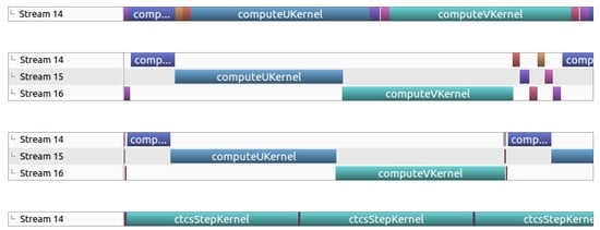 We started the analysis of the three different numerical schemes using the Nsight extension in Visual Studio and the standalone Visual Profiler application in the exact same manner as if we were profiling from C/C++. Nsight was run on a laptop with a GeForce 840M GPU in Windows, and the Visual Profiler on a desktop with a GTX780 GPU in Linux. Our workflow started by profiling the code, identifying the performance bottleneck, optimizing the bottleneck, and finally profiling to determine if the optimization was successful [47]. To ensure that our optimizations do not introduce errors in the code, we frequently ran integration and regression tests against reference solutions.