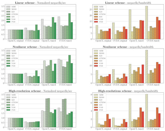 The overall performance gain of our optimization is shown in Figure 6, where all results are given in megacells per second normalized with respect to the original PyOpenCL implementation in the left-hand column and GPU bandwidth (see Table 2) in the right-hand column. The original porting from PyOpenCL to PyCUDA gave a noticeable reduction in performance for the high-resolution scheme on all GPUs. After careful examination, we attributed this to different default compilation flags in PyCUDA and PyOpenCL: In PyCUDA, the fast-math flag was shown to double the performance for the high-resolution scheme, while we found that it gave less than a 5% performance gain with PyOpenCL. Note that the slowdown in the original porting is much less for the linear and nonlinear schemes, as these schemes contain fewer complex mathematical operations, and we instead observe a varying effect on performance of porting the original OpenCL code to CUDA. When examining the numerical schemes one by one, we see that the optimizations performed for the high-resolution scheme appears to be highly portable when back-ported to PyOpenCL for all GPUs. For the tuned nonlinear scheme, however, we saw that the 840M and V100 GPUs give a significantly higher performance using CUDA than OpenCL. Finally, for the linear scheme, the performance is similar for all GPUs, and only the 840M and V100 GPUs benefit significantly from the optimization effort. In total, we see that certain scheme and GPU combinations result in a significant speedup for CUDA over OpenCL, but we cannot conclude whether this is caused by differences in driver versions or from other factors. We are therefore not able to claim that CUDA performs better than OpenCL in general. When looking at the performance normalized with respect to the specific GPU bandwidth, we see that the 840M laptop GPU offers the highest performance for all schemes, followed by the two most recent high-end GPUs, the V100 and P100.