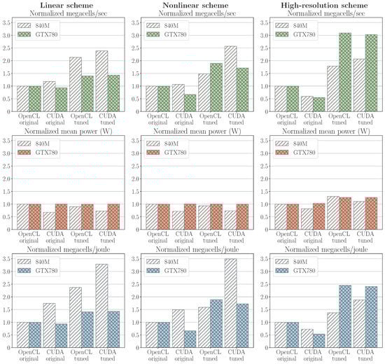 In general, we observe that all experiments show a mean power usage within about 30% of the original OpenCL versions, with the exception of the nonlinear scheme on the V100. On the other side, the computational performance increases up to 5 times (the high-resolution scheme on the GTX780). This shows that the most important factor for improving power efficiency is to increase computational performance.