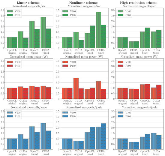 Comparison of original, ported, and optimized codes measured in megacells per second (top row), mean power usage (mid row), and megacells per joule (bottom row), normalized with respect to the original OpenCL implementation, for the Tesla P100 and V100 GPUs. The power is measured through nvidia-smi and represents the power consumed by the GPU only. On the V100, there are only minor differences in mean power consumption between different versions of the linear and high-resolution scheme, but CUDA uses more power than OpenCL for the nonlinear scheme. CUDA is, however, more power-efficient than OpenCL for all three tuned schemes on this GPU. On the P100, the mean power consumption is equal for all versions of the linear and nonlinear schemes, which means that power efficiency becomes equivalent to computational efficiency. For the high-resolution scheme, we see that the mean power consumption increases for the tuned codes, but the computational performance increases more, meaning that the power efficiency is still improved by 30%–40%.