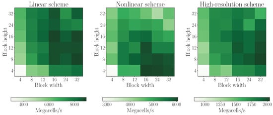 Heat map of performance as a function of block width and block height for selected sizes for the high-resolution scheme on three different GPUs. Notice that even though the performance patterns have similarities, the performance on the V100 would be suboptimal if the optimal configuration from the GTX780 is used. The performance increase is 2–5× for all three GPUs from the slowest to the fastest block size.
