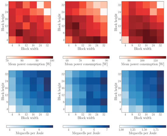 In the previous section, all benchmarks were configured using the optimal block size configuration for computational efficiency. Here, we analyze how sensitive power efficiency is to the block size configuration, and whether there are other optimal configurations if we aim for power efficiency instead of computational performance.