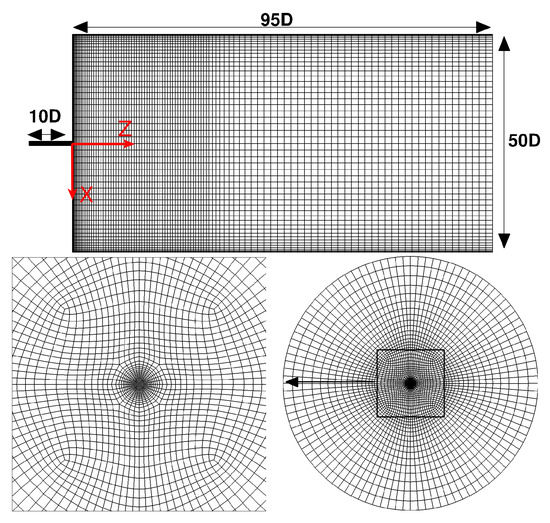 To consider grid independency for our domain, three different grid sizes (1,100,000, 700,000, 400,000) were compared based on the velocity profile of the continuum phase along three sections and . The maximum error was 4% for the 700,000-cell grid. Therefore, the simulations were done using 700,000 cells in the domain. The computational domain and its grid quality are shown in Figure 1. A block of the structured grid is applied between the jet and cylindrical enclosure instead of using the polar grid in order to keep the number of the grid elements as low as possible. The PISO-SIMPLE (PIMPLE) algorithm with exterior loops is used to solve the pressure-velocity coupling of the Navier–Stokes equations and increase the time intervals [25]. The time interval is determined dynamically based on the Courant number. This number is kept less than 1 for the entire simulation. Diffusion terms are discretized following the standard second-order central differencing scheme, and the convection terms are discretized by the second-order “Gauss limited Linear” scheme, which based on Total Variation Diminishing (TVD) method. Lagrangian equations are integrated by analytical methods [26]. Particle tracking is performed using the Face-to-face particle tracking procedure approach [27].