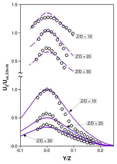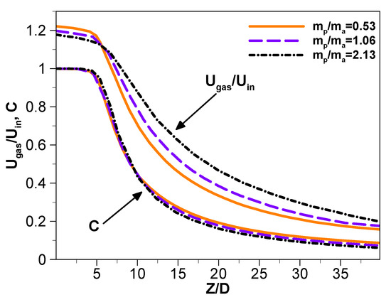 This lies in the fact that the downward motion of the particles changes the momentum direction downward and deviates from the original path. Moreover, it counteracts the influence of the ambient entrainment toward the jet in the lower region of the jet, which increases the rate of spread of the jet tracer as the particles leave the jet. In Figure 4, the path of the motion of the continuum phase is drawn by connecting the maximum points of the tracer. Furthermore, the rate of spread of the jet tracer at the bottom of the jet increases with growth in mass loading. Initially, the particles and jet have the same velocity. However, after a while, the particles tend to push jet in the downward direction as a result of gravitational force. It can be said that, gradually, the particles have more effects on the jet streamline. At higher Stokes number, the accumulation of continuum phase occurs at larger distance from the nozzle. This is due to the presence of larger particles, having a lower area/volume ratio, resulting in smaller drag forces per volume. It can be said that particles with a larger diameter and higher stokes number will decay their momentum at larger distances from the nozzle. On the other hand, particles will exit the jet and transfer their downward velocity, as a result of gravity, to the surrounding fluid. Due to this, smaller particles can transfer more downward momentum to the fluid. As a result, jets laden with smaller particles will have a downward trend. Initially (Z/D = 0), the particles and jet have the same velocity. However, after a while, the particles tend to push jet in the downward direction as a result of gravitational force. It can be said that, gradually, the particles have more effects on the jet streamline. The decay rate of the axial velocity and the concentration of the continuum phase (tracer) in the direction of the jet (Figure 4) are depicted in Figure 5.