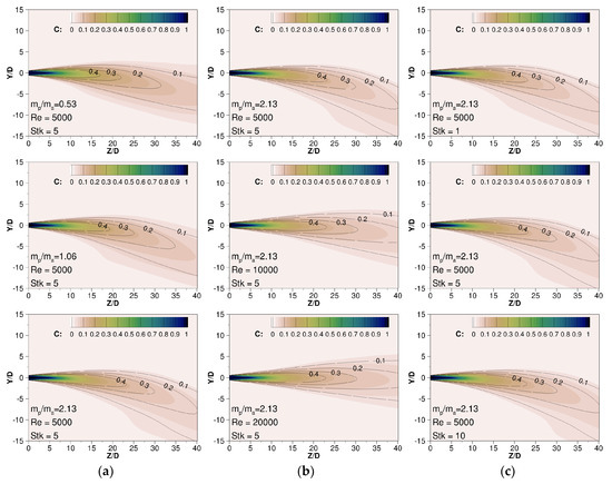 The contours of jet tracer scalar: (a) The left side is for different mass loading ratios at Re = 5000, Stk = 5. (b) The middle one is for different Reynolds numbers at m_p⁄m_a = 2.13, Stk = 5. (c) The right side is for different Stokes number at m p⁄m_a = 2.13, Re = 5000. The lines represent the velocity contour.