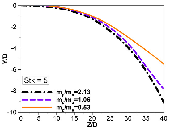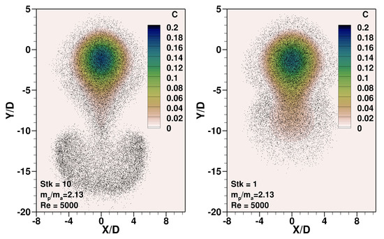 Figure 3c shows that the spread of the jet tracer suddenly increases at the bottom of the jet. Considering Figure 7, this increase is due to the particles being released from the jet bottom. These particles drag down part of the continuous phase, which increases the depth of the continuous phase penetration beneath the jet. Moreover, it can be seen that particles move out of the jet faster and farther away due to the Stokes number rise. This leads to an increase in the depth of the continuous phase beneath the jet. Nevertheless, since the coupling amongst particles is weaker for higher Stokes number, they cannot deflect the jet trajectory and gradually depart the jet. In comparison, as Figure 8 demonstrates, particles with stronger coupling, due to lower Stokes number, remain in the jet resulting in jet deflection.