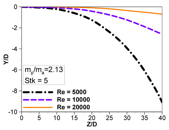 The effect of Reynolds number on the trajectory of the particle-laden jet.