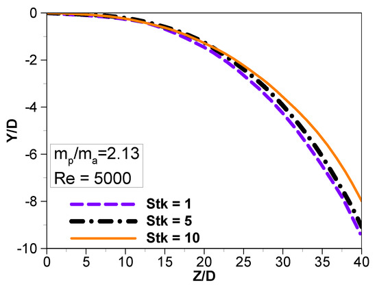 The effect of Stokes number on the trajectory of particle-laden jet.