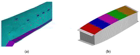 ‘Shell 181’ element type of the ANSYS element library is used for the skin, rib and spar-web panels. The spar flanges are modeled using the ‘Link8’ element type, which is a 3-D spar element with uniaxial tension-compression behavior and has three degrees of freedom at each node. The entire FE model of the 2-spar and 4-spar configurations comprises approximately 40,000 and 43,000 elements, respectively. A detail of the FE model discretization in the lower side, which shows the FE mesh around the access holes area is shown in Figure 3a. It must be mentioned that all geometrical input of the model is introduced in the FE model parametrically (skin and web thickness, flange areas, bolt-hole dimensions, etc.), in order to enable variations of these parameters during the optimization procedure. Each skin panel is divided to five areas, at each of which a different thickness value may be assigned, i.e., the skin panel thickness is assumed to vary chordwise to allow weight reduction, as shown in Figure 3b. The FE model’s boundary conditions comprise fixing of all degrees of freedom in the wing root.