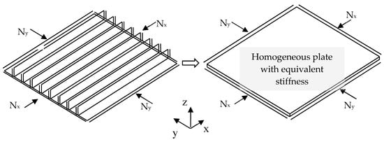 Equations (1) and (2), , are the components of the equivalent bending stiffness matrix. The equivalent bending stiffness matrix yields using an energy approach. In more detail, by equating the strain energy and the work done by the compressive forces of the stiffened panel with the respective energy of an equivalent homogeneous panel (no stiffeners), the equivalent bending stiffness terms can be calculated. Furthermore, in Equations (1) and (2), is the length of the unloaded edge of the panel and is the panel’s aspect ratio. , are the uniform distributed load applied to the panel’s edges as shown in Figure 4. , are the number of buckling half waves and their values are determined to result the minimum critical buckling load .