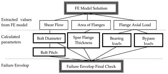 The bearing bypass analysis is the final constrain considered in the present design. The important geometric characteristics of the joint area are bolt diameter (), bolt pitch () and spar flange thickness (). The joint bearing and bypass loads, required as input for the bearing bypass analysis, are extracted from the FE model solution. In parallel, experimentally obtained failure envelopes are constructed based on joint geometrical and material data. It is consequently checked if the applied bearing and bypass loads satisfy the strength requirements. The extracted values from the FE model, as well as the calculated parameters for plotting the final failure envelope, are illustrated in the flow-chart of Figure 6. The details of the process implementation in the case of the current composite wing joints are described in the next paragraphs.